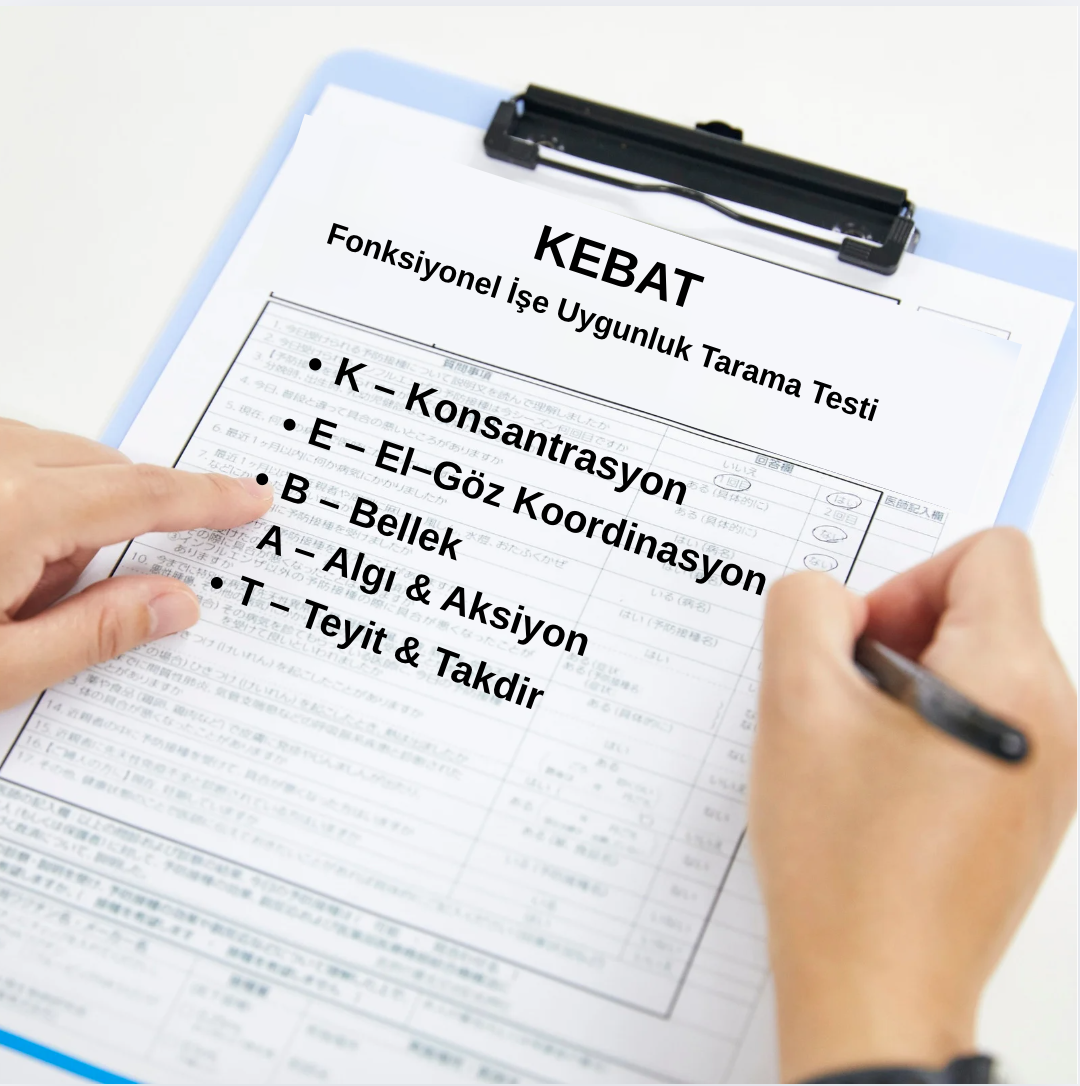İşbu metin; işyerinde uygulanmakta olan KEBAT (Konsantrasyon – El-Göz Koordinasyonu – Bellek – Algı/Aksiyon – Teyit/Takdir) Fonksiyonel İşe Uygunluk Taraması’nın;