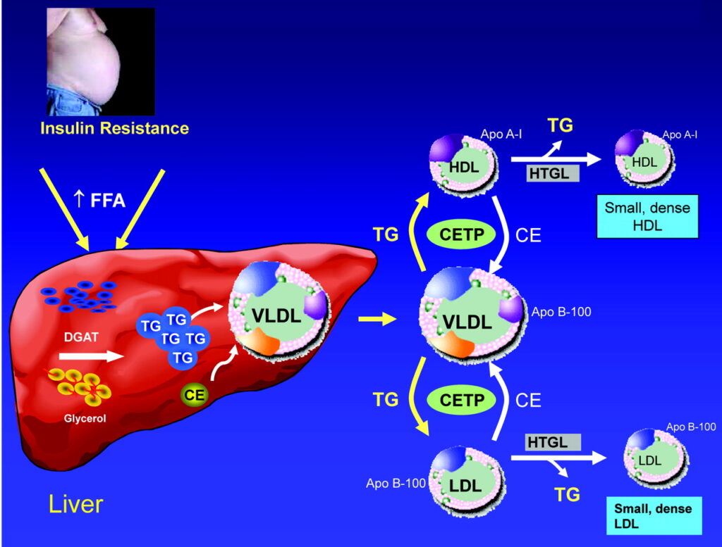 İnsülin direnci varlığında, yağ hücrelerinden karaciğere daha fazla serbest yağ asidi taşınır ve karaciğer daha fazla VLDL üretir.